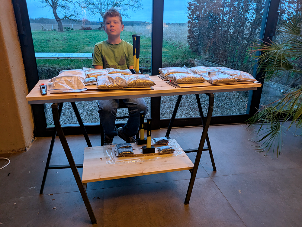 Les coffrages d'extrados, bien lestés, sont au collage... Plomb, sable et marteaux.
